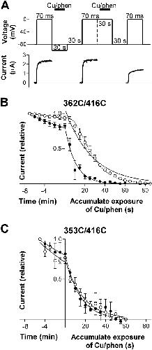 Figure 2. . Voltage and time dependence of disulphide bond formation. (A) State-dependent formation of disulphide bonds between 362C and 416C for three consecutive voltage steps to 0 mV. Voltage protocol is shown in the top panel. Cu/phenanthroline was added for 20 s, as indicated. Applied at −100 mV, Cu/phenanthroline did not affect the current; applied at 0 mV, Cu/phenanthroline clearly reduced the current. (B and C) Steady-state current at the end of a 70-ms pulse to 0 mV versus accumulated exposure to 2/100 μM Cu/phenanthroline. The voltage was stepped to −80 mV for 20 s, then to either −80 mV or to 0 mV for 30 s, followed by a voltage step to −80 mV for 10 s. For each episode, Cu/phenanthroline was applied for a brief period (usually 5 s) during the 30-s step either to −80 mV or to 0 mV. The data points at time < 0 were obtained in the absence of Cu/phenanthroline. n = 3–7 for all data points. Eq. 1 was fitted to the data points, with w = 1 for the continuous curves and w = 4 for the dashed curve. (B) Disulfide bond formation in 362C/416C at −80 mV (open circles) and 0 mV (closed circles). Spontaneous current reduction (time < 0): τ(−80) = 104 min and τ(0) = 33 min (w = 1). Cu/phenanthroline-induced current reduction (time > 0): τ(−80) = 27 s and τ(0) = 10 s (w = 1). τ(−80) = 14 s for w = 4. (C) 353C/416C. Spontaneous current reduction (time < 0): τ(−80) = 18 min and τ(0) = 24 min (w = 1). Cu/phenanthroline-induced current reduction: τ(−80) = 18 s and τ(0) = 15 s (w = 1).