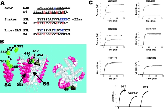 Figure 1. . Formation of disulphide bonds between residues in S4 and residues in the pore domain. (A) Sequences of the proposed voltage sensor paddle (Jiang et al., 2003a). α-Helical parts are underlined. S3b and S4 are packed to each other as suggested by Jiang et al. (2003a); that is, COOH terminus of S3b is to the right while COOH terminus of S4 is to the left. 22 residues of the Shaker S3-S4 linker are omitted. Positive charges in red and negative in blue. The net charge of the paddles: +3 (KvAP), +1 (Shaker), and 0 (RnorvEAG). (B) Molecular structure of S4 of KvAP (Jiang et al., 2003a) and the pore domain (S5-S6; side view to the left and top view to the right) of KcsA (Doyle et al., 1998). The residues used in the present investigation are labeled (Shaker numbering). The α-helical parts of S4, S5, and S6 in one subunit are space filled. The structure between 353 and 362 is not known for the Shaker K channel and is only drawn as a random coil. (C) Voltage-clamp data for six double-cysteine mutations. Current in response to a voltage step to 0 mV in control solution (1K), after incubation in 0.5 mM DTT (continuous line), and in control solution (1K), after >1 min exposure to Cu/phenanthroline (dotted line). Holding voltage was −80 mV. (Bottom) DTT (20 mM) reversed the Cu/phenanthroline effect, showing that Cu/phenanthroline induced disulfide bonds (shown for 359C/416C channels).