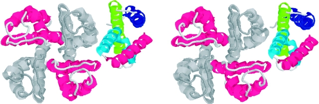 Figure 4. . Model for S4 location in the Shaker K channel (stereoview). To construct a structural model of the Shaker K channel, we used the KcsA structure (Doyle et al., 1998) for the pore and added the isolated S1-S4 structure of KvAP (Jiang et al., 2003a). The top of S4 is in close proximity to the top of S5 in this model. The four subunits of KcsA are colored red or gray. Only one of the four voltage-sensing S1-S4 domain is shown: S1 (blue), S2 (green), S3 (light blue), and S4 (dark red).