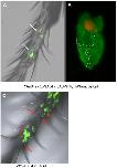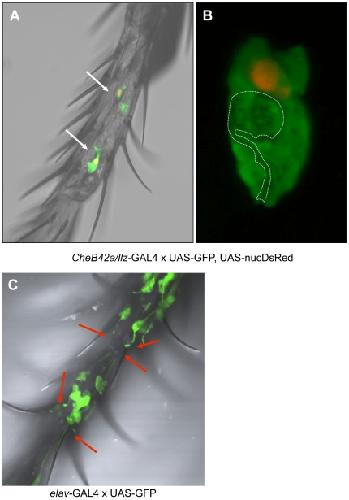 Figure 2. The CheB42a/llz locus is preferentially expressed in non-neuronal sensory structures.A–B. Driving expression of GFP with the CheB42a/llz promoter revealed expression in cells in the front legs of males. Co-expression of GFP and DsRed containing a nuclear localization signal revealed expression in relatively large cells with a single labeled nucleus. Morphology of the CheB42a/llz-expressing cells suggested the cells might enwrap another cell type; white dotted line represents boundaries of a potentially enwrapped cell with neuronal morphology (see Movies S1 and S2 for 3-D reconstruction of typical CheB42a/llz cells). C. Pan-neuronal elav promoter driving GFP expression in the same male leg segment as shown in panel A. Typical neuronal sensory morphologies such as sensory cilia extending to the sensory hairs are apparent.