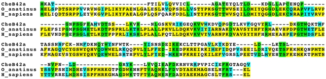 Figure 1. CheB42a encodes a protein with sequence similarity to aryl sulfotransferase 1A.Top line shows predicted aminoa acid sequence of Drosophila melanogaster CheB42a, and second and third lines show predicted amino acid sequences of Ornithorhynchus anatinus (platypus) and Homo sapiens (human) aryl sulfotransferase. Green, conserved residues; yellow, conserved residues in two of the aligned proteins; blue, similar residues. Accession numbers for the aligned proteins are: CheB42a, NM_206043.2; O_anatinus, NP_001121091; H_sapiens, NP_003157.1.