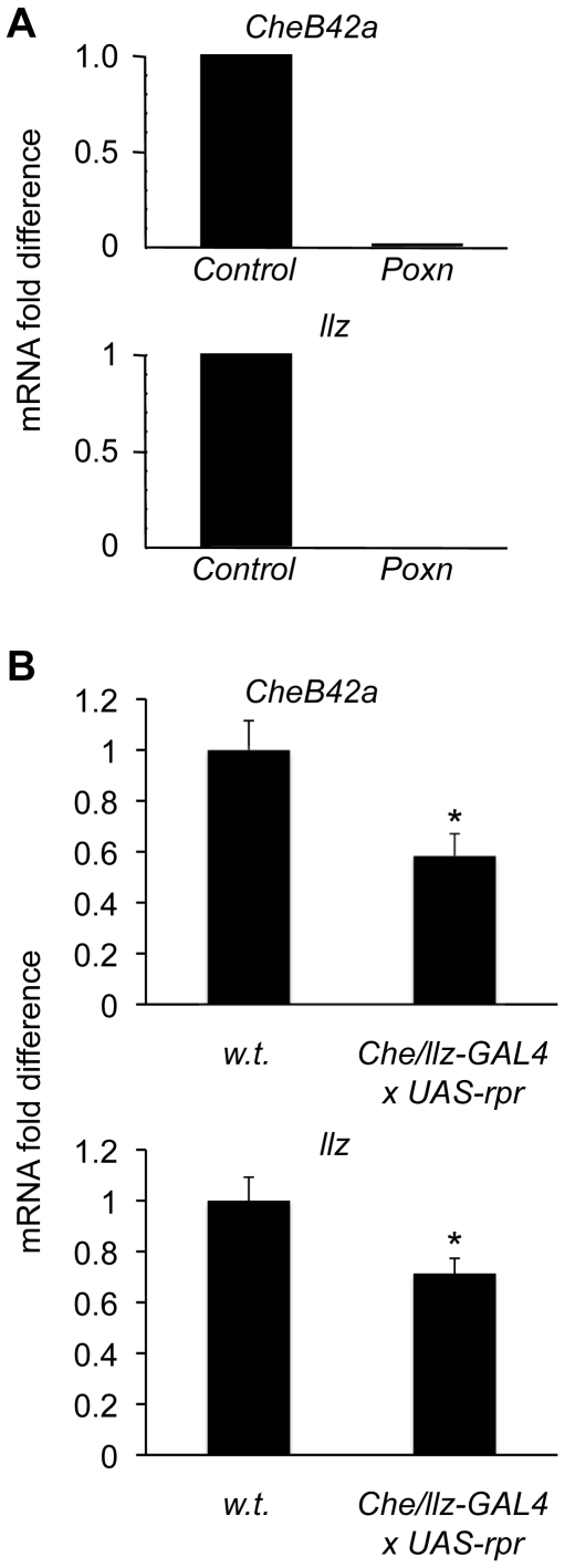 Figure 3. CheB42a and llz are expressed in the same chemosensory-related cells.A. The expression levels of both CheB42a and llz were reduced in homozygous Poxn mutants relative to heterozygote controls. Total RNA was extracted from male appendages and was analyzed by quantitative RT-PCR. Data are mRNA in Poxn relative to wild-type control. Expression levels were normalized to the housekeeping gene rp49. y-axis represents arbitrary mRNA fold-difference units, with control expression levels designated as 1 unit. B. Genetic ablationCheB42a/llz-expressing cells reduced expression of both transcripts. The CheB42a promoter-GAL4 line was crossed to UAS-rpr, which induces cell-death [29]. Analysis as in panel A.