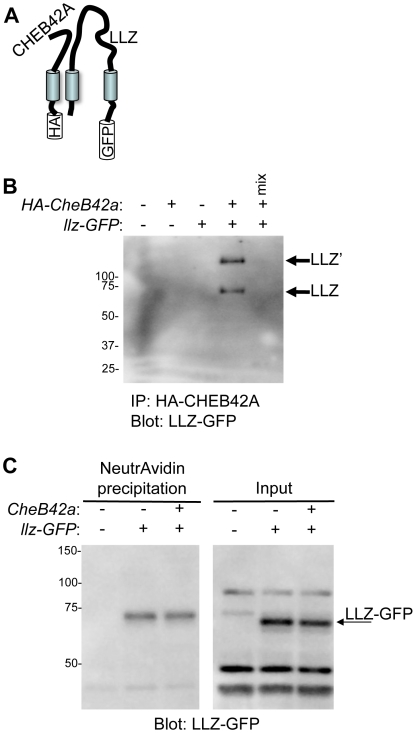 Figure 5. CHEB42A and LLZ can form a protein complex.A. Schematic of transfected proteins. B. Co-expression of tagged CHEB42A-HA and LLZ-GFP proteins. Immunoprecipitation with anti-HA antibody co-precipitated LLZ. “mix” indicates an experiment in which equal amounts of protein from the singly-transfected cells were mixed prior to immunoprecipitation as a control for non-specific interactions. Expression of llz produced two protein bands, the expected lower molecular mass band, plus a band of higher molecular mass. We do not know the identity of the more slowly migrating band; it might represent an LLZ-containing multiunit complex that is resistant to SDS denaturation or might represent post-translational modifications of LLZ [45]. We also attempted to detect HA-CHEB42A after immunoprecipitating LLZ-GFP, but were not successful. C. CHEB42A did not affect LLZ surface expression. COS7 cells were transfected with llz and either GFP or CheB42a. Surface expression level was estimated with biotinylation of surface proteins followed by neutravidin precipitation. To estimate total protein, protein input was directly blotted with anti-GFP antibody (right panel). We did not observe the larger LLZ' band in the surface expression study. We speculate that differences in sample processing protocols between the IP and surface expression studies could affect solubility and detection of larger protein complexes.
