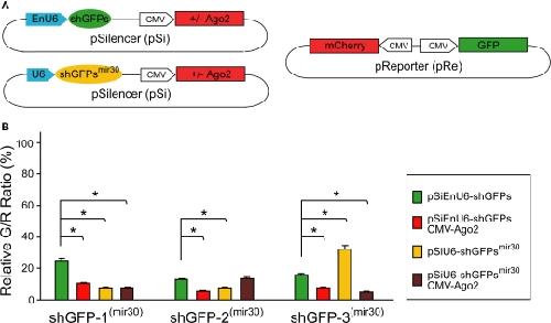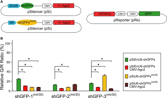 Figure 3. Effect of shRNA structure on RNAi efficacy. (A) Diagram of the pSi constructs containing shGFP or shGFPmir30 with or without Ago2 co-expression (left), and the pRe construct (right) for simultaneous GFP and mCherry expression. (B) G/R fluorescence intensity ratio measured from cells transfected with pSi constructs containing shGFP or shGFPmir30 with or without Ago2 co-expression. For shGFPs, Ago2 co-expression broadly enhances GFP knockdown (red bars). For shGFPsmir30, the RNAi efficiency increases for shGFP-1mir30 and shGFP-2mir30 but not shGFP-3mir30 (yellow bars). Additionally, Ago2 co-expression enhances knockdown with all shGFPsmir30to a level comparable to Ago2 co-expression with shGFPs. Asterisks represent statistical significance (p < 0.05, ANOVA-Scheffe's test).