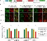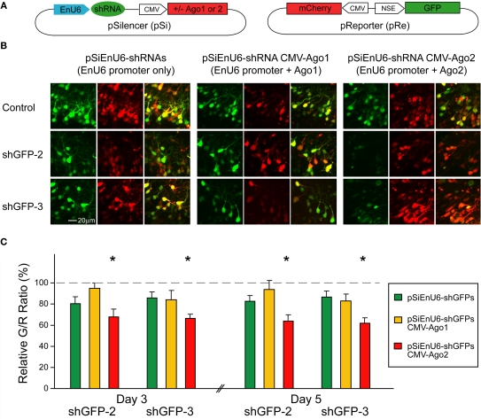 Figure 4. Ago2 expression enhances RNAi in neurons of living Xenopus tadpoles. Neurons, transfected with pSi and pRe constructs, were imaged after 3 or 5 days to evaluate GFP knockdown by G/R fluorescence intensity ratio. (A) Diagram of the pSi (left) containing EnU6-shGFPs with or without Ago protein co-expression, and the pRe (right) for simultaneous GFP and mCherry expression. (B) Representative images from CNS neurons 3 days after transfection of the pSi constructs as indicated. (C) G/R ratios measured from CNS neurons transfected with different pSi constructs driving shGFPs, normalized to control cells. Note that the pSi construct containing the EnU6-shGFPs and Ago2 (red bars) has greater knockdown than the EnU6 promoter alone (green bars) or EnU6-shGFPs with Ago1 (red bars). Asterisks represent statistical significance between neurons transfected with no shRNA and shGFPs with the same silencer configuration (p < 0.05, ANOVA-Scheffe's test).
