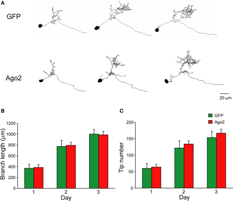 Figure 5. Neurons expressing ectopic Ago2 acquire normal dendritic arbor structure. Individual optic tectal neurons expressing GFP or GFP + Ago2 were imaged daily over 3 days in living animals (A). Total dendritic branch length (B) and branch tip number (C) were determined on 3D reconstructions of tectal neurons. Total branch length and branch tip number are comparable between GFP and Ago2-expressing neurons (p > 0.05, Mann–Whitney test).