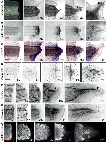 Figure 2. Characterization of the early, intermediate, and late phases of tail regeneration. (A) Tadpole tails imaged using bright field microscopy at early (0 h, 6 h); intermediate (24 h) and late phases (48 h and 72 h) of tail regeneration. Black open arrowhead shows typical dorsal constriction at 6 h post amputation; blue arrowhead shows pre-regenerative tissue; red arrowhead shows nascent finepidermis at the distal tip; black arrowhead = spinal cord; green arrowhead = notochord, orange arrowhead = melanophrore. (B) Tadpole tails stained with Sudan Black B (inflammatory cells). (C) Tadpole tails stained by whole-mount in situ hybridization for mmp7 (inflammatory cells). (D) Tadpole tails stained by immunohistochemistry for mitotic cells (pH3, shown in black). The tail in each panel is outlined in red and the plane of amputation is shown in green. (E) Tadpole tails stained to reveal the neuronal tissue by immunohistochemistry (acetylated tubulin, shown in black). (F) Tadpole tails stained by immunohistochemistry for vascular tissue (GFP antibody in mTie-2::eGFP transgenic line, shown in black). The open purple arrowhead shows a typical eGFP positive "clot" at the injured dorsal aorta. Green arrowheads show distally projecting blood vessels. (G) Tadpole tails stained by immunohistochemistry for muscletissue (12/101). The open orange arrowhead shows the presence of skeletal muscle in the regenerated portion of the tail. Red scale bar for each row is 250 μm. Note that the images in panels D-F are black and white reversals (i.e. shown as negative images).