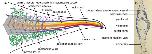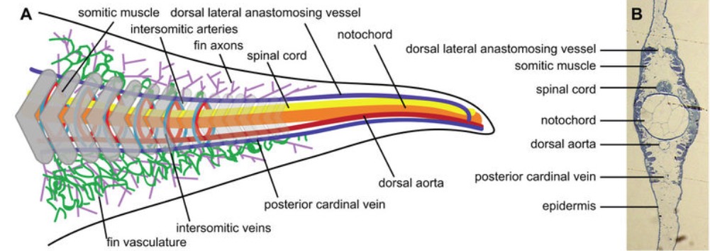 Schematic diagram of the major blood vessels and structures in the Xenopus tadpoletail (A) and in transverse section of tadpoletail visualized with toluidine blue.