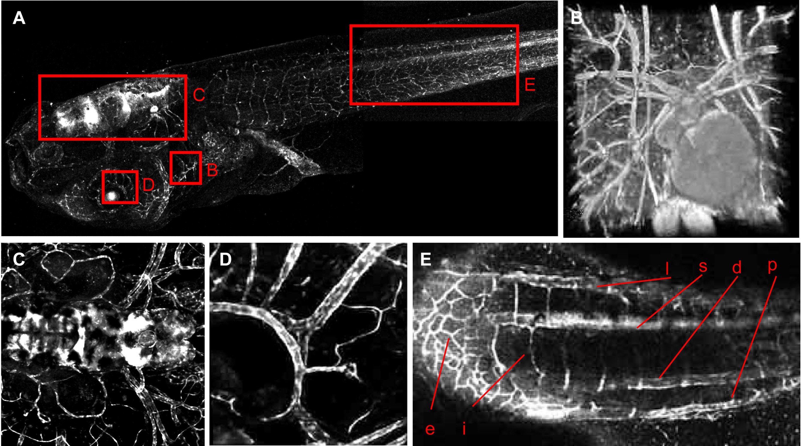 Additional file 1. Figure S1 - A transgenic Xenopus tropicalis line that expresses eGFP in its vasculature. (A) A series of merged confocal images from transgenic Xenopus tropicalis tadpole expressing eGFP under the control of the murine Tie-2 promoter; the four red boxes show the heart (B), brain and associated vasculature (C), the vasculature that surrounds the eye (D), and the vasculature in the tail (E). The single confocal slice in (E) depicts the dorsal lateral anastomosing vessel (l), spinal cord (s), dorsal aorta (d), posterior cardinal vein (p), epithelial vasculature (e), and intersomitic vessels (i).