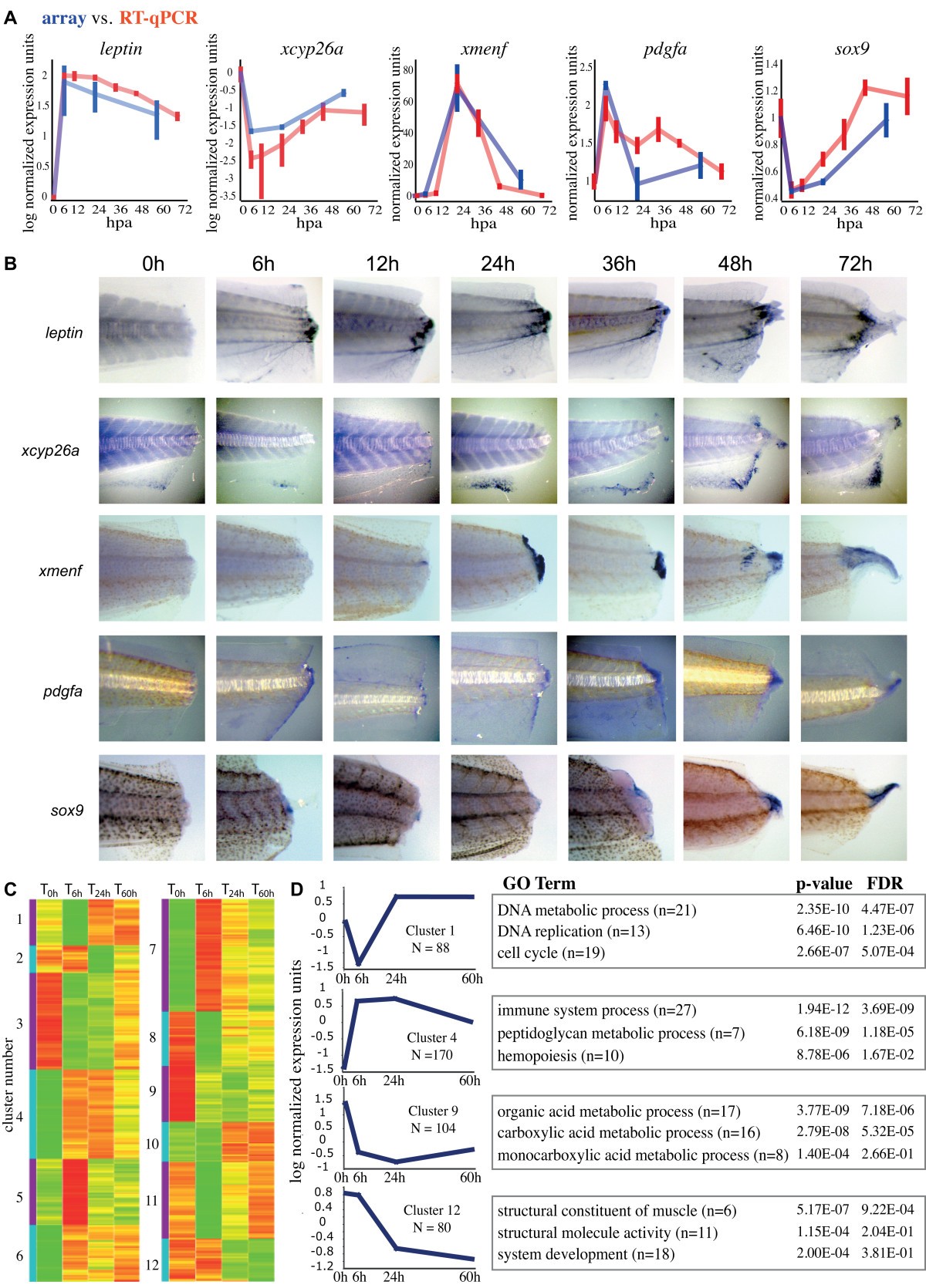 Figure 4. Validation and GO analysis of highly significant targets. (A) The validation of five highly significant array targets (blue) is plotted against normalized RT-qPCR derived expression profiles (red). Note that lines connecting each time point are meant to serve as a visual aide. (B) Shows expression patterns of RT-qPCR validated targets using whole-mounts in situ hybridization for leptin, xmenf, xcyp26a, sox9 and pdgfa at 0 h, 6 h, 12 h, 24 h, 36 h, 48 h, and 72 hours post-amputation. (C) Heat map of all highly significant and dynamic targets produced a group of 1441 targets, grouped into 12 clusters by their similar expression changes through the array time points. (D) Gene ontology (GO) analysis of the twelve clusters in (C) showed four clusters over-represented with at least three GO terms accompanied by a p-value under 1e-3 and false discovery rate (FDR) under 0.5. Error bars represent standard error of mean (SEM).
