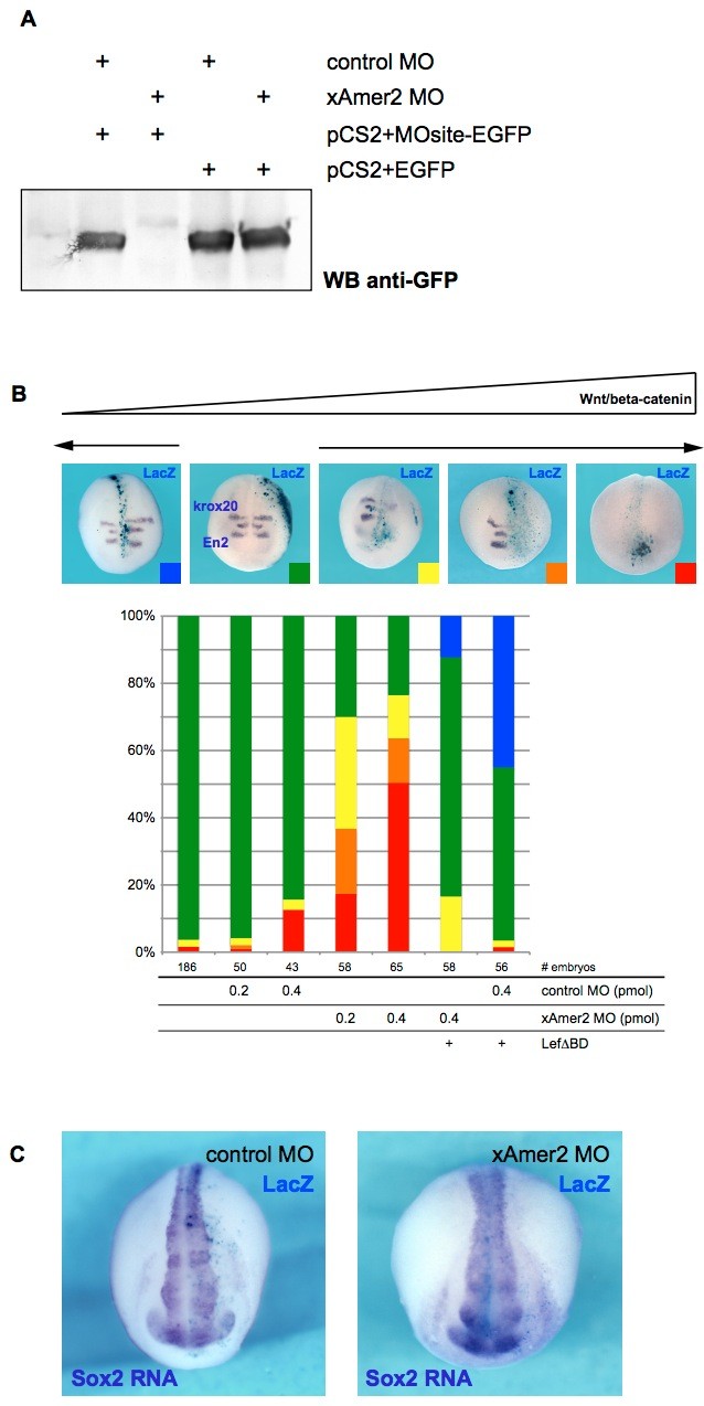 Figure S4. Amer2 affects neuroectodermal patterning. A, The xAmer2-MO sequence specifically targets xAmer2. Embryos were injected in both blastomeres at the 2-cell-stage with 0.8 pmol of xAmer2-MO or control-MO along with either 100 pg RNA of the Amer2 pCS-MOsite-EGFP construct or pCS-EGFP alone. The Amer2-MOsite construct contains the xAmer2 sequence targeted by the Amer2-MO fused to EGFP. Injected embryos and uninjected controls were analyzed by western blotting at NF stage 12.5 as indicated. B, Depletion of xAmer2 by Amer2-MO injection affects anterior-posterior patterning of the neuroectoderm as shown by expression of En-2 and krox-20. Embryos were injected in one anterior-dorsal blastomere at the 8-cell-stage with 100pg LacZ DNA plus 0.2 or 0.4 pmol of Amer2-MO or control-MO. For rescue experiments 500 pg of LefδBD RNA were co-injected as indicated below the panels. Embryos were stained for LacZ to label the injected side, probed by in situ hybridization for expression of En-2 and krox-20 at NF stage 20 and scored for reduced or expanded expression of the markers on the injected side as compared to the uninjected side of the same embryo. Images on the top show embryos representative for observed phenotypes, injected sides are oriented to the right in all images. Images on the top show embryos representative for observed phenotypes. The colored insets represent phenotypes as following: blue=enhanced/posteriorly shifted markers at injected side, green=equal/normal expression of markers, yellow=markers reduced/anteriorly shifted at injected side, orange=markers lost at injected side, red=markers lost at injected and uninjected side of the embryo. The graph shows the statistics of at least three independent experiments. Numbers below the graph represent analyzed embryos. C, Depletion of xAmer2 by Amer2-MO injection does not affect neural induction as revealed by Sox2. Whole mount in situ hybridization with the pan-neural marker Sox2 at NF stage 20 as indicated. Embryos were injected in both dorsal blastomeres at the 4-cell-stage with 0.8 pmol of xAmer2-MO or control-MO and 100 pg LacZ DNA.