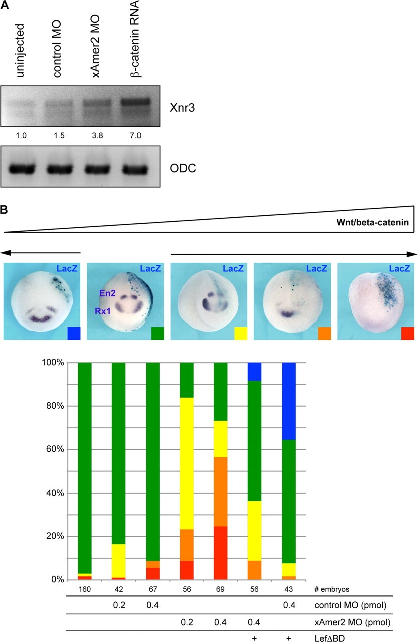 FIGURE 4. xAmer2 negatively regulates Wnt signaling in vivo. A, depletion of xAmer2 by xAmer2 MO (cf. supplemental Fig. 4A) increased expression of the Wnt target gene Xnr3. Xenopus embryos were injected in both dorsal blastomeres at the four-cell stage with 0.4 pmol of xAmer2 MO or control MO or with 100 pg of β-catenin RNA as a positive control, and Xnr3 mRNA levels were determined by RT-PCR at NF stage 10.5. Ornithine decarboxylase (ODC) RT-PCR was used for normalization. Numbers between the panels represent the levels of Xnr3 normalized to ornithine decarboxylase as determined by densitometry. B, depletion of xAmer2 by xAmer2 MO affected anterior-posterior patterning of the neuroectoderm, consistent with a negative function in Wnt signaling. Embryos were injected in one anterior-dorsal blastomere at the eight-cell stage with 100 pg of lacZ DNA plus 0.2 or 0.4 pmol of Amer2 MO or control MO without or with 500 pg of LefδBD RNA as indicated. Embryos were stained for lacZ to label the injected side, probed by in situ hybridization for expression of Rx1 and En-2 at NF stage 20, and scored for reduced or expanded expression of the markers on the injected side compared with the uninjected side of the same embryo. Images show embryos representative of the observed phenotypes. Injected sides are oriented to the right in all images. The colored insets represent phenotypes as follows: blue, enhanced Rx1 and En-2; green, equal/normal expression of markers; yellow, markers reduced/anteriorly shifted at the injected side; orange, markers lost at the injected side; red, markers lost at both the injected and uninjected sides of the embryo. The graph shows the statistics of at least three independent experiments. Numbers below the graph represent analyzed embryos.