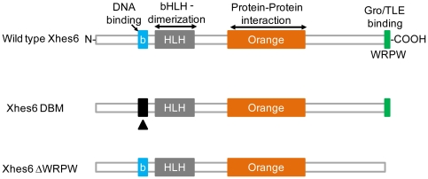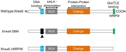Figure 1. Conserved domains in Xhes6 and mutants used in this study.Xhes6 contains a conserved basic domain, required for DNA binding, a helix-loop-helix domain, implicated in dimerization with Xhes6 and other bHLH proteins, an “orange” domain, comprising the third and fourth helices of the protein, required for protein-protein interaction, and a C terminal WRPW motif, required for binding to Groucho/TLE family transcriptional coregulatory proteins. In this study a mutant of the basic domain which is unable to bind DNA (Xhes6 DBM) and a mutant lacking the WRPW motif (Xhes6 ΔWRPW) were used.