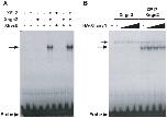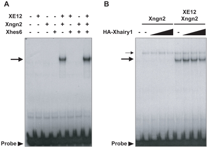 Figure 4. Effects of Hes6 and Xhairy1 proteins on Xngn2/E12 DNA-binding activity.A DNA fragment containing E-box element from the mouse NeuroD promoter was labeled with 32P and incubated with the in vitro translated proteins shown. The reaction mixture was then analyzed on a native polyacrylamide gel. (A) Effect of Xhes6 on DNA-binding activity of Xngn2/E12. Arrow indicates complex of Xngn2/E12 and DNA. Free probes are shown by arrowhead. (B) Effect of Xhairy1 on DNA-binding activity of Xngn2/E12. Faint bands with slow mobility (thin arrow) are non-specific protein and DNA complexes. Thick arrow indicates Xngn2/XE12 probe complex. Neither Xhes6 and Xhairy1 affect heterodimer formation or the DNA binding activity of Xngn2/XE12 proteins.