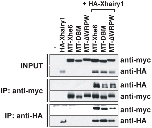 Figure 6. Physical Interaction of Xhes6 and Xhairy1.HA tagged Xhairy1 and myc tagged Xhes6 proteins (wild type, DNA binding mutant (DBM) and WRPW deletion mutant (ΔWRPW)) were translated in vitro and mixed as indicated. Following incubation with the antibody shown immunocomplexes analyzed by sodium dodecyl sulfate gel electrophoresis after which tagged proteins were detected by Western blotting. Wild type and both mutant forms of Xhes6 protein bind Xhairy1.