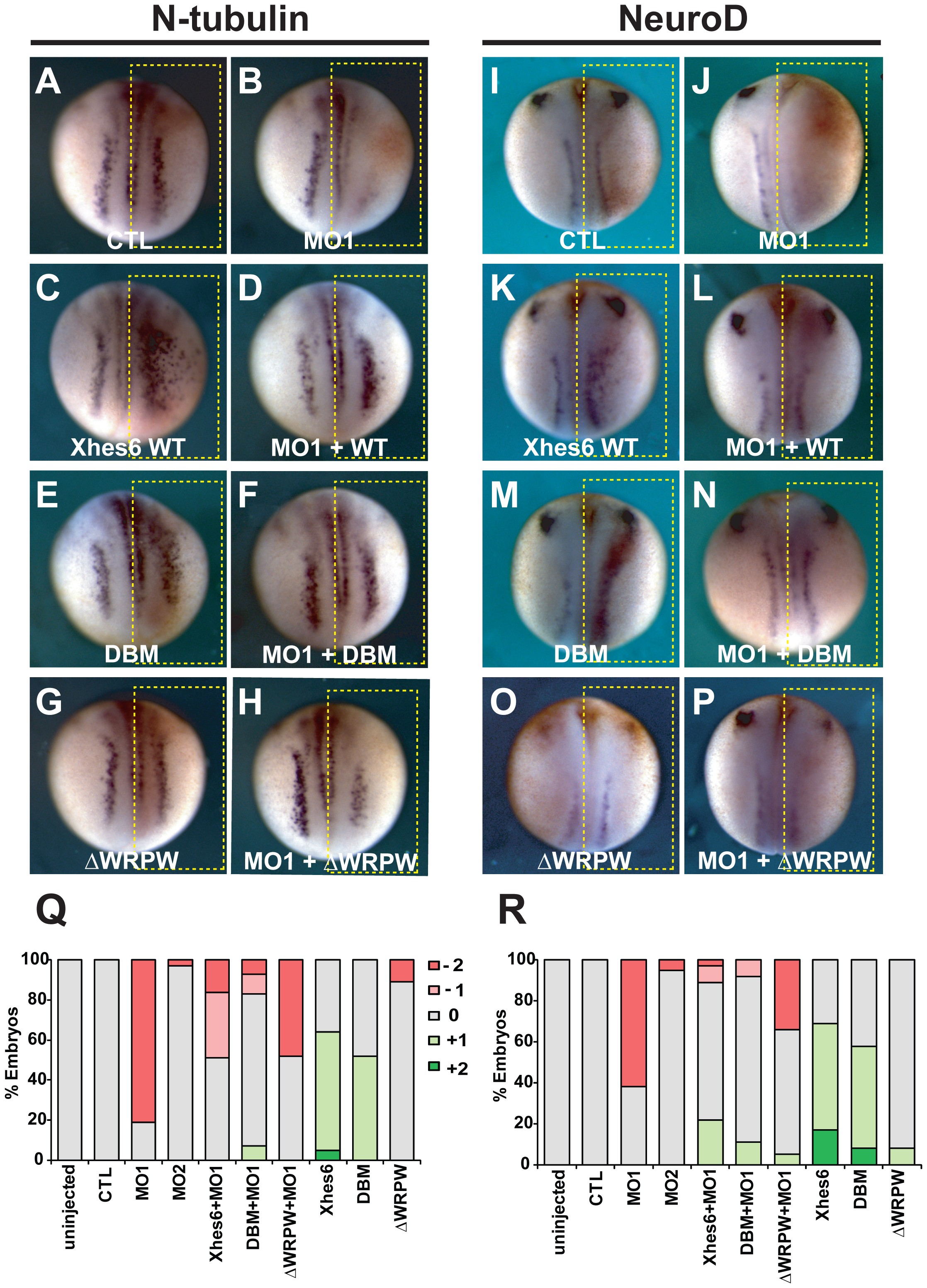 Whole mount in situ hybridization of neurula stage embryos for neural markers neural β-tubulin (N-tubulin, A-H) or NeuroD (I-P). A, B, I, J: One cell of two cell stage embryos was injected with control (CTL, A, I) or Xhes6 (MO1, B, J) morpholinos along with β-gal tracer mRNA (red staining). Injection of MO1 decreases both N-tubulin and NeuroD expression on the injected side (yellow box). C-H, K-P: Rescue of MO1 phenotype. 500 pg of mRNA encoding wild type Xhes6 or DNA binding domain (DBM) or Groucho binding domain, (ΔWRPW) mutants was injected with or without MO1. Overexpression of Xhes6 (C, K) or DBM (E,M) alone enhances neural differentiation, both Xhes6 and DBM rescue neural maker expression in Xhes6 morphants (D, F, L, N). The ΔWRPW mutant has minimal effect when injected alone (G, O) and is less efficient in rescuing the MO1 phenotype. Q,R quantitation of phenotypes observed, scored as in Fig. S2, Q, N-tubulin mRNA expression, corresponding to panels A-H, R, NeuroD mRNA expression, corresponding to panels I-P. Full data on the frequency of phenotypes and the number of embryos analyzed is given in Table 1.