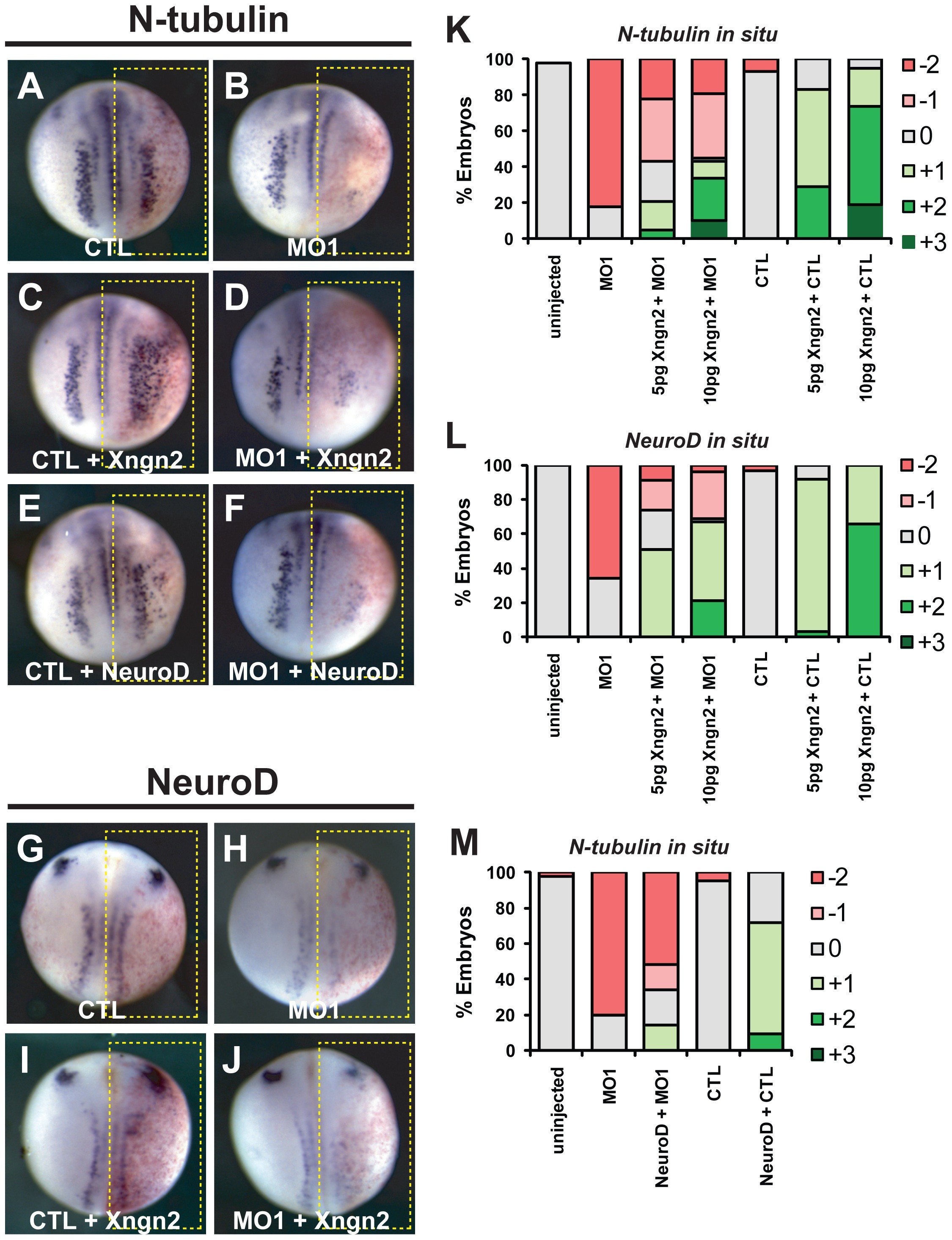 Xngn2 or NeuroD mRNA was injected into one cell of two cell stage embryos with or without control (STD CTL) or Xhes6 (MO1) morpholinos. At neurula stage, embryos were analysed for expression of transcripts encoding N-tubulin (A−F) or NeuroD (G−J) by in situ hybridization. Injection of mRNAs encoding Xngn2 and NeuroD increases the number of primary neurons (C, E) but this effect is blocked by co-injection of the Xhes6 MO (D, F). Xhes6 is also required for Xngn2 to induce its target gene, NeuroD (J). K-L quantitation of phenotypes seen, scored as shown in Fig. S1; K, L effects of MO1 on Xngn2 induced expression of N-tubulin (K) and NeuroD (L) mRNA, M, effect of MO1 on N-tubulin mRNA expression induced by NeuroD. Full data on the frequency of phenotypes and the number of embryos analyzed is given in Table 2.