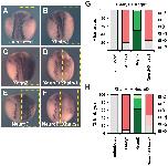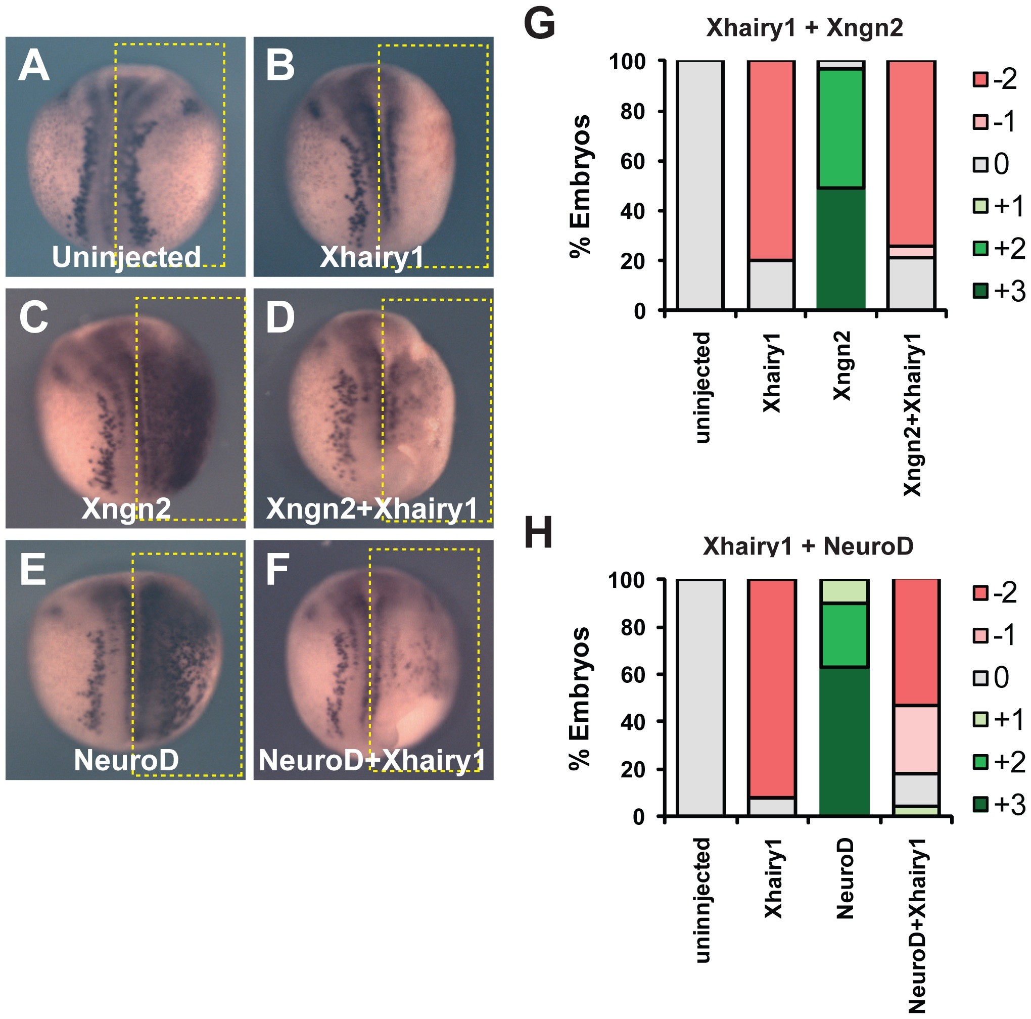 Embryos either uninjected (A) or with mRNAs encoding Xhairy1 (B), Xngn2 (C), Xhairy1 plus Xngn2 (D), NeuroD (E) or NeuroD plus Xhairy1 (F) injected into one cell at the two cell stage were analyzed for N-tubulin expression by in situ hybridization at neurula stage. G,H quantitation of phenotypes seen, scored as shown in Figure S2; Full data on the frequency of phenotypes and the number of embryos analyzed is given in Tables 3, 4, and 5.