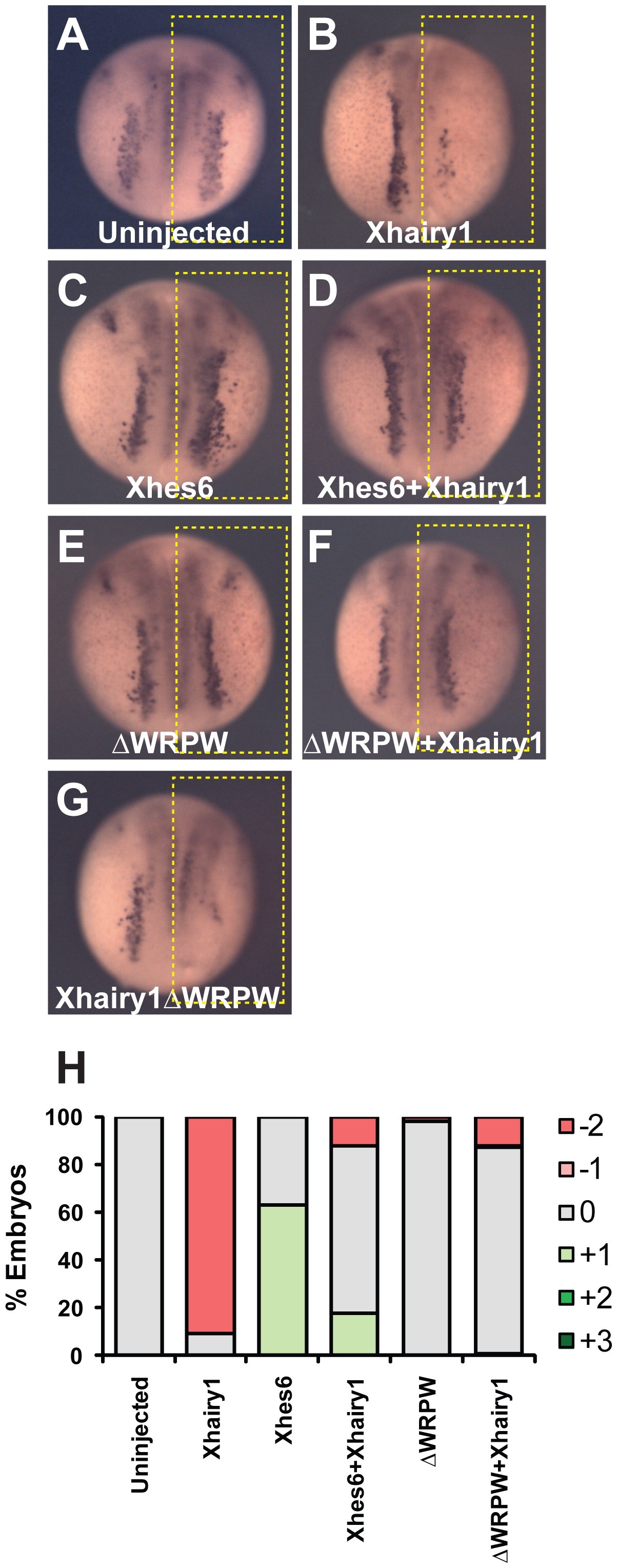 Expression of N-tubulin transcript in uninjected embryos (A) or embryos in which mRNA encoding Xhairy1 (B), Xhes6 (C), Xhairy1 plus Xhes6 (D), Xhes6ΔWRPW mutant (E), Xhairy1 plus Xhes6ΔWRPW (F) or Xhairy1ΔWRPW mutant (G) was injected into one cell at the two cell stage. H: quantitation of changes in N-tubulin mRNA expression, scored as shown in Figure S2. Full data on the frequency of phenotypes and the number of embryos analyzed is given in Table 6.