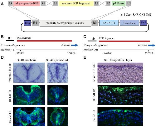 Fig. 3. A highly efficient method of testing promoters and creating transgenic lines using pTransgenesis. (A) Genomic PCR fragments are cloned directly into the p2 position, thus allowing the recombination shown. (B,C) PCR products encoding regions 5â² to nectin-2 and vimentin were generated and tested for transcriptional activity in F0 X. laevis and in F1 X. tropicalis. (D) Transverse sections through the hindbrain and spinal cord of embryos (dorsal side up) stained for endogenous vimentin expression (upper panels), or Venus transgene expression (green) in F0 transgenic X. laevis (middle panels) and F1 transgenic X. tropicalis (lower panels). (E) Transverse sections through the neural plate of stage 18 embryos (dorsal side up) stained for endogenous nectin-2 expression (upper panel), or Venus transgene expression (green) in F0 transgenic X. laevis (middle panel) and F1 transgenic X. tropicalis (lower panel). Nuclei are stained with DAPI (blue) in middle and lower panels in D and E.