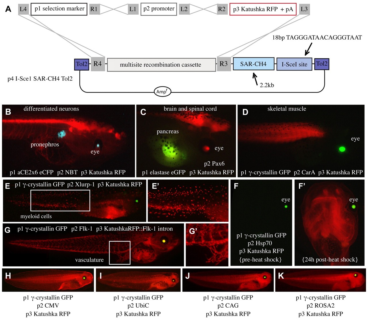 Fig. 2. Incorporation of Xenopus-compatible elements into pTransgenesis. (A) Schematic of recombination with a Xenopus-compatible p4 vector containing a single I-SceI site, Tol2 elements, and SAR-CH4 sequences, p3 Katushka RFP and Xenopus-compatible p1 and p2 constructions. (B-K) Transgenic tadpoles from the resulting recombinations are shown. Individual p1, p2, p3 constructions and expression domains are written on each panel in white. Images in Eâ² and Gâ² are magnified images of the boxed regions in E and G, respectively. Image in Fâ² shows the induction of RFP from the heat-shocked tadpole in F.