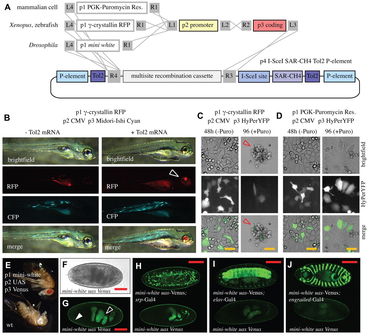 Fig. 4. pTransgenesis in various models. (A) Schematic showing plasmid recombinations yielding plasmids compatible with transgenesis in HeLa cells, Xenopus, zebrafish and Drosophila. (B) Images of zebrafish injected with the indicated p1, p2, p3 and p4 elements with or without Tol2 mRNA. Open arrowhead points to activity of the p1 γ-crystallin RFP marker. (C,D) Results from HeLa cell transfections and puromycin (Puro) selection using pTransgenesis-engineered constructions. Red open arrow indicates dying cells. (E) Drosophila melanogaster engineered with the indicated pTransgenesis constructs versus wild type. (F,G) Phase contrast and fluorescence image of pTransgenesis-engineered Drosophila embryo. Open and closed arrowheads indicate gut and cuticle autofluorescence, respectively. (H-J) Confocal images from the indicated Gal4 crosses. (H) srp-Gal4, stage 16 embryo, GFP-labelled hemocytes. (I) eval-Gal4, stage 16 embryo, GFP-labelled CNS. (J) engrailed-Gal4, ventral view of stage15 embryo during dorsal closure process, GFP-labelled engrailed domain segments. Scale bars: 25 μm in C,D; 100 μm in F-J.