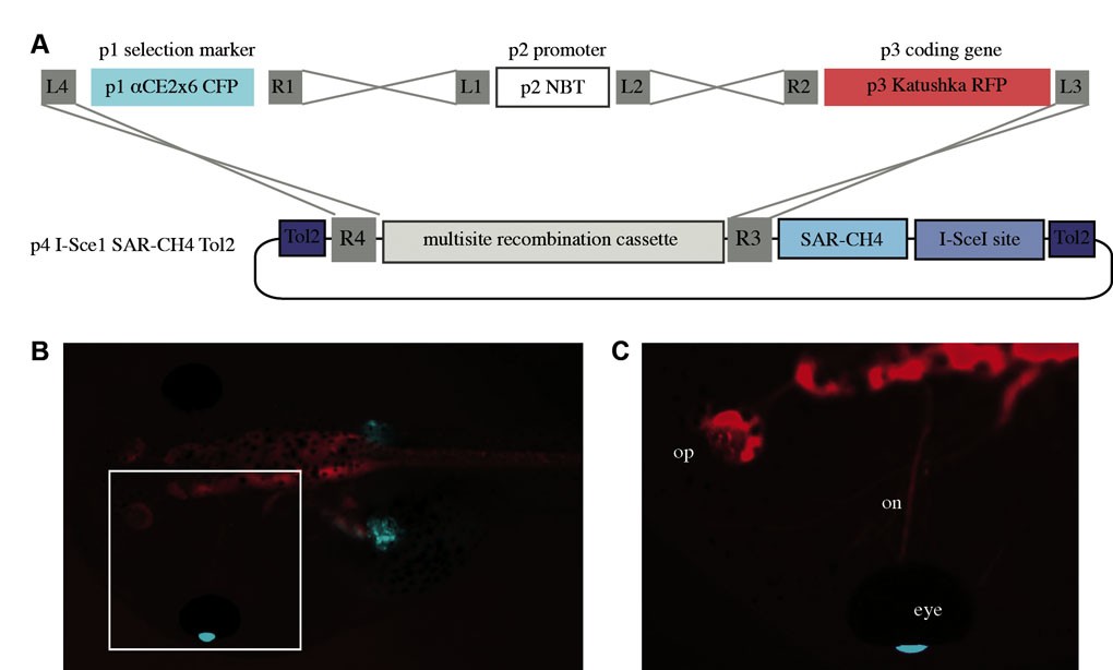 Fig. S1. Germline transmission of pTransgenesis constructs using I-SceI. (A) The construction shown was used to create a transgenic line in X. laevis using I-SceI-mediated transgenesis. The p2 NBT element drives RFP expression in differentiated neurons. (B) Fluorescent images derived from the F1 generation of this transgenic line. (C) Enlarged view of white box in B showing optic nerve (on) and olfactory placode (op).