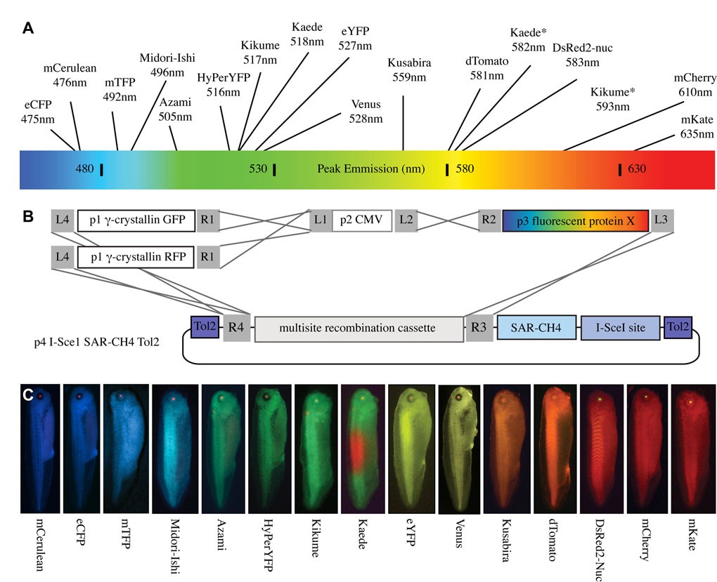 Fig. S2. A p3 library of fluorescent proteins. (A) Fifteen fluorescent proteins with the approximate peak emissions indicated were incorporated into the p3 coding sequence position of pTransgenesis. Note: Kaede* and Kikume* possess red-shifted emissions following photoactivation. (B) The p3 fluorescent proteins were linked downstream of the p2 CMV promoter and with a p1 γ-crystallin selection marker. (C) Resulting constructs were tested for functionality via REMI. Note: fluorescence was captured using CFP, GFP or RFP filters and then pseudocoloured to represent each protein's peak emission more accurately. The Kaede protein has undergone a red-green colour shift after exposure to 405 nm light.