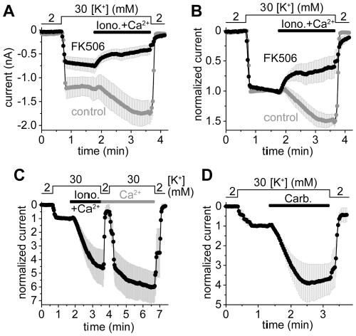 Figure 1. Calcineurin activates mouse TRESK several-fold in HEK293 cells.A. Calcium-dependent activation of TRESK current was measured at −100 mV in HEK293 cells after FK506 pretreatment (1 µM, 15–40 min, FK506, black curve) or without the application of the calcineurin inhibitor (control, gray curve). Whole-cell patch clamp recording was performed with calcium-free pipette and bath solutions containing 50 µM EGTA. Pipette solution contained GTP (0.1 mM) and ATP (1 mM). Extracellular [K+] was increased from 2 to 30 mM (as indicated above the graph) and the cells were subsequently challenged with ionomycin (1 µM) plus Ca2+ (2 mM, Iono.+Ca2+, horizontal black bar). B. Normalized responses to ionomycin plus calcium were calculated from the same recordings as represented in panel A. FK506 prevented the calcium-dependent activation of TRESK. C. TRESK currents during the stimulation with ionomycin plus calcium (Iono.+Ca2+, horizontal black bar) were measured with calcium-free pipette solution containing 50 µM EGTA but neither ATP nor GTP. Calcium (2 mM) was continuously present after the withdrawal of ionomycin (Ca2+, horizontal gray bar). Extracellular [K+] was repeatedly changed between 2 and 30 mM as indicated above the graph. The currents were normalized to the basal value measured before the stimulation. D. TRESK current was stimulated with carbachol (50 µM) via endogenous muscarinic receptors. The pipette and bath solutions were Ca2+-free, containing 50 µM EGTA and no ATP/GTP. Normalized curves were plotted; for average current data of panel C and D see Figure S3.