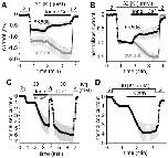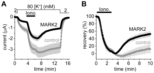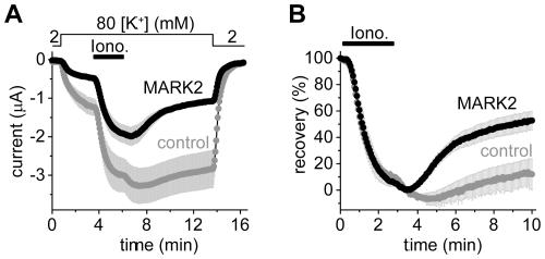 Figure 3. The coexpression of MARK2 accelerates the recovery of the K+ current of S264E mutant mouse TRESK after the stimulation with ionomycin.A. Average currents of two groups of oocytes coexpressing S264E mutant TRESK with MARK2 kinase (MARK2, black curve), or expressing only the S264E mutant channel (control, gray curve) were plotted. The cells were stimulated with ionomycin (Iono., 0.5 µM, as indicated by the horizontal black bar) in 80 mM extracellular [K+] (as shown above the graph). B. Recovery was calculated from the same recordings as in panel A. Note the accelerated recovery in the cells coexpressing MARK2 with the S264E mutant channel.