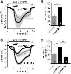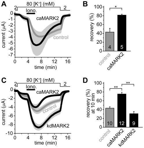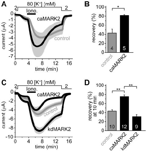 Figure 5. Microinjection of constitutively active MARK2 protein into Xenopus oocytes accelerates the recovery of TRESK current to the resting state after ionomycin-stimulation.The coexpression of a 14-3-3-insensitive, constitutively active form of MARK2, but not the kinase-dead version of the enzyme, inhibits TRESK. A. Xenopus oocytes coexpressing human TRESK with human 14-3-3η were microinjected with the constitutively active, partially 14-3-3-insensitive GST-MARK2-T208E,T539A kinase (caMARK2, black curve), or with the heat-inactivated form of the same protein (control, gray curve). The cells were stimulated with ionomycin as in Figure 2.A. The microinjection of the proteins was performed 144–169 min before the application of ionomycin. B. Average K+ current recoveries are shown at the end of the measurement in the groups introduced in panel A. Recovery in the group of oocytes microinjected with the active kinase (caMARK2) was significantly accelerated, compared the control oocytes (*p<0.002). C. Average currents of three groups of oocytes were compared. In the first group, mouse TRESK was coexpressed with 14-3-3-insensitive constitutively active MARK2 (caMARK2, MARK2-T208E,S400A,T539A construct, black curve,). In the second group, the channel was coexpressed with kinase-dead MARK2 (kdMARK2, MARK2-T208A,S212A,S400A,T539A construct, black curve). In the third group, only TRESK was expressed (control, gray curve). The experimental protocol was the same as in Figure 2.A. D. Average recoveries at 10 minutes in the three groups shown on panel C were plotted as indicated below the columns. The K+ current recovered more rapidly in the caMARK2 group than in the control or kdMARK2 cells (**p<10−5 for both comparisons with Student's t-test, which is significant at the p<0.05/3 limit according to Bonferroni correction.) The numbers in the bars in panel B and D indicate the number of measured oocytes.
