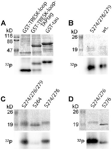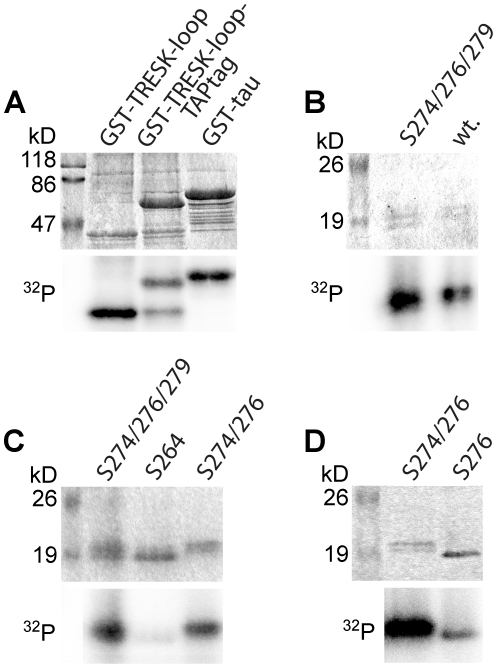 Figure 6. MARK2 directly phosphorylates the S274/276/279 cluster of mouse TRESK in vitro.A. GST-TRESKloop, GST-TRESKloop-TAPtag or GST-tau (positive control) fusion proteins were phosphorylated with constitutively active Trx-His6-MARK2-T208E in the presence of [γ−32P]ATP. The upper panel shows the SDS-PAGE gel stained with Coomassie Blue, whereas the autoradiogram of the same gel is on the lower panel. The two GST-fusion constructs containing amino acids 185–292 of mouse TRESK were labeled with 32P to a similar intensity as the GST-tau control (see the lower32P panel). In the GST-TRESKloop-TAPtag sample, an incompletely translated (or degradation) product (slightly larger than GST-TRESKloop in the other lane, see the upper panel) was also phosphorylated. B. Wild type TRESKloop-His8 (wt.) or the mutant version of this protein containing only S274, S276 and S279 (S274/276/279 lane) were phosphorylated with GST-MARK2-T208E. Note that the substrate containing only the three serines of the S274/276/279 cluster was also strongly labeled with 32P. C. The mutant TRESKloop-His8 substrates, containing only the serines indicated above the lanes, were phosphorylated with GST-MARK2-T208E. Both substrates retaining S274 and S276 (S274/276/279 and S274/276 lanes) were labeled with 32P, in contrast to the protein containing only serine 264 (S264 lane). D. The mutant TRESKloop-His8 substrates, containing both serine 274 and 276 (S274/276 lane) or only serine 276 (S276 lane) were phosphorylated with GST-MARK2-T208E. Note that the S276 substrate was labeled with 32P, although to a lesser extent than the protein retaining both S274 and S276.