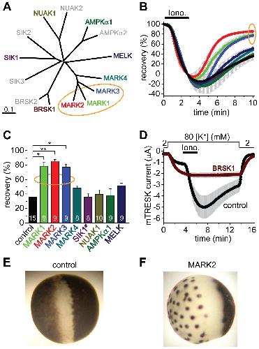 A. Multiple alignment and phylogenetic tree of mouse full-length AMPK-related kinases was created with Clustal W2 and TreeView. The enzymes, which have been cloned and functionally tested on TRESK, are shown in colors different from gray. The MARK kinases, which efficiently inhibit TRESK, are indicated with an orange ellipse. B. Time-dependent recovery of background K+ currents after the ionomycin stimulation (Iono., 0.5 �M, as indicated by the horizontal black bar) is shown for the groups of oocytes coexpressing the different AMPK-related kinases with mouse TRESK. Color code is the same as in panel A. Rapid recovery of K+ current in the MARK1, 2 and 3 groups is indicated with an orange ellipse. C. Average recoveries at the end of the measurement are shown for the different groups. The number in the columns indicates the sample size. SIK1 construct (SIK1#) contained amino acids 1�343, which included the kinase domain. The recovery in the MARK1, 2 and 3 groups was significantly different from that of the control cells (one-way ANOVA, followed by Tukey HSD test, *p<0.01, **p<0.001). D. Oocytes coexpressing BRSK1 and mouse TRESK (BRSK1, ferruginous curve, n = 16) or expressing only the channel (control, black curve, n = 15) were stimulated with ionomycin as in the case of the other AMPK-related kinases in panels A, B and C. Note that ionomycin did not activate TRESK current in the cells, which coexpressed BRSK1 with the channel. E. Representative photograph of a control oocyte expressing TRESK channels. Appearance is not different from a non-injected cell (not shown). F. Representative photograph of an oocyte coexpressing TRESK with MARK2 kinase. Note the reduced pigmentation on the animal pole, and the peculiar dark dots on the vegetative hemisphere following a more or less hexagonal arrangement.