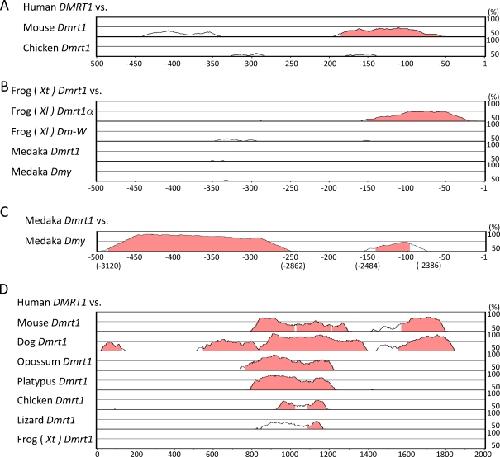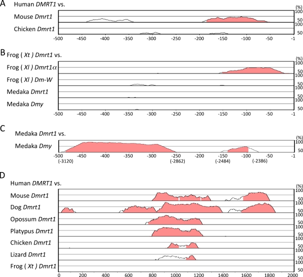 Fig. 2. Comparisons of the 5â²-flanking regions among several vertebrate Dmrt1 homologues using mVISTA. Graphs were constructed using the AVID alignment program. Numbers with minus sign correspond to bp upstream of the transcription start site (+1). a Comparison of the first 500 bp of the mouse or chicken Dmrt1 promoter sequence, located upstream of the coding exon 1, with that of human DMRT1. b Comparison of the first 500 bp of the frog (Xl) Dmrt1α, frog (Xl) Dm-W, medaka Dmrt1, or medaka Dmy promoter sequence, located upstream of the noncoding exon 1, with that of frog (Xt) Dmrt1. c Comparison of the medaka Dmy 5â²-flanking region with the first 500 bp of medaka Dmrt1. The 8-kb 5â²-flanking region of the transcription initiation site of medaka Dmy was used, and the homologous regions are shown. d Comparison of the 2-kb region between the 3â²-flanking region of kank1 and the 5â²-flanking region of Dmrt1, a region conserved in several vertebrate species. The graph was constructed in comparison to the human 2-kb sequence. The locations of the conserved regions are shown in Supplementary Table 1. Dog, Canis lupus familiaris; Lizard, Anolis carolinensis