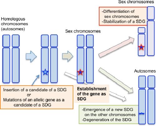 Fig. 5. Proposed model for evolutionary relationships between the appearance of sex-determining genes (SDGs) and sex chromosomes in vertebrates. First, a candidate SDG emerges or evolves on one chromosome of a pair of autosomes by insertion or mutation. Then, the candidate gene may be established as an SDG during species divergence with few morphological changes in the two chromosomes, in cases like that of the heterogametic XY or ZW sex chromosomes in the teleost fish medaka (O. latipes) carrying the Y-linked SDG Dmy, or the African clawed frog (X. laevis) carrying the W-linked SDG Dm-W, respectively. If the new SDG emerges as a stronger regulator for sex determination, the original SDG or its candidate might degenerate into a psuedogene, as in the case of sex determination in O. luzonensis, which is closely related to the medaka species. In contrast, if an SDG strongly contributes to the stability of a sex-determining system during species divergence, differentiation of the sex chromosomes might be allowed, leading to specialization of the heterogametic sex chromosomes and to stabilization of the SDG. This might be the case for the heterogametic XY sex chromosomes in eutherian mammals carrying the Y-linked SDG, Sry