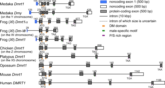Fig. 1. Exonâintron structures of Dmrt1 orthologues and its paralogous sex-determining genes Dmy and Dm-W in vertebrates. The number shows the size (bp) of each exon. Noncoding exon 1 is shown as a blue box; other noncoding and coding regions in exons are shown as white and gray boxes, respectively. The locations of DM domains, male-specific motifs, and P/S (proline/serine)-rich regions are indicated by orange, green, and purple boxes, respectively. Medaka, Oryzias latipes; Frog (Xl), Xenopus laevis; Frog (Xt), Xenopus (Silurana) tropicalis; Chicken, Gallus gallus; Platypus, Ornithorhynchus anatinus; Opossum, Monodelphis domestica; Mouse, Mus musculus; Human, Homo sapiens