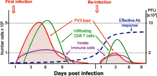 Figure 2. Schematic view of Xenopus adult immune response kinetics in infected kidneys. During both primary and secondary FV3 infections, MHC class II+ innate immune cell effectors (leukocytes) rapidly accumulate in the kidneys (violet line), the main site of infection, and pro-inflammatory genes (e.g., TNF-α, IL-1β) are induced. This is followed by an adaptive CD8 T cell response and infiltration (green line) that peak at 6 dpi during a primary infection. During a second FV3 infection, CD8 T cell response and infiltration peak 3 days earlier, which suggests T cell memory. However, the lower number of infiltrated CD8 T cells (5 time less) suggests that anti-FV3 antibodies (blue line) and B cell memory are playing a prominent role during secondary infection resulting in a faster viral clearance (red line). |
