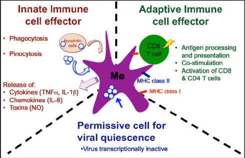 Figure 3. Schematic view of the complex role of macrophages in Xenopus host defenses against RV. As innate immune cell effectors, macrophage can acquire viral antigen by direct infection, pinocytosis of opsonized viruses or phagocytosis of infected cells, as well as release cytokines, chemokines and toxins that contribute to limiting the infection. As an adaptive immune cell effector, macrophages process and present viral antigens through MHC class I and class II pathways, up-regulated co-stimulatory molecules (B7, CD40) and activate anti-RV CD8 and CD4 T cells. Finally, macrophage can harbor quiescent RV in asymptomatic frogs. |
