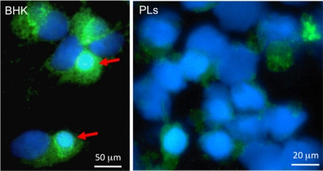 Figure 4. Immunofluorescence microscopy of baby hamster kidney cells (BHK, left) and Xenopus PLs infected in vitro for 2 days with FV3 (0.3 MOI). Cells were cytocentrifuged on microscope slides, fixed with formaldehyde, permeabilized with ethanol, incubated with a rabbit anti-53R and FITC-conjugated donkey anti-rabbit Abs (Green); then stained with the DNA dye Hoechst-33258 (Blue) mounted in anti-fade medium and visualized with a Leica DMIRB inverted fluorescence microscope. Note the large viral assembly sites in BHK cells that contain large amount of viral DNA stained Hoechst-33258 and anti-53R Ab (arrows). In contrast, anti-53R staining is weaker in PLs, and no assembly sites are detected. |