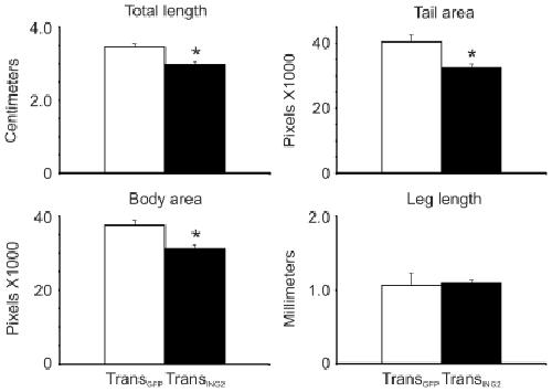 Figure 1. Comparison of morphological characteristics of ING2-overexpressing tadpoles (TransING2, filled bars; n = 19) and transgenic tadpoles expressing GFP only (TransGFP, empty bars; n = 10).The asterisk denotes a significant difference between the two groups (ANOVA, p<0.001; body area: Mann Whitney U, p = 0.005). The error bars represent the standard error of the mean.