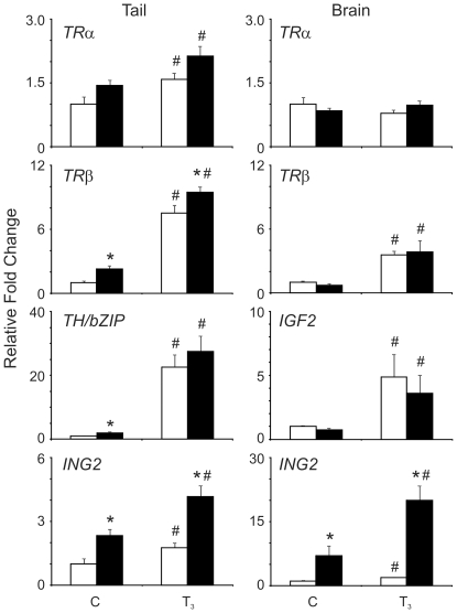 Figure 3. QPCR data of mRNA isolated from the tails and brains of TransGFP (white bars; n = 5) or TransING2 (black bars; n = 9–10) transgenic tadpoles treated with solvent only (C) or 10 nM T3 (T3) for 48 h.The gene transcripts are indicated above each graph. The bars denote the relative transcript levels derived as described in the Materials and Methods. The asterisk denotes a significant difference between the TransING2 and the TransGFP transgenic animals (p<0.05). The “#” indicates statistical significance relative to the vehicle control within a transgenic type.