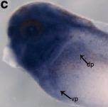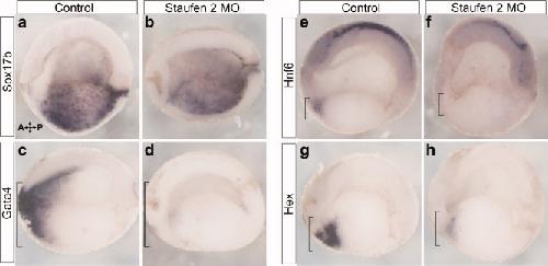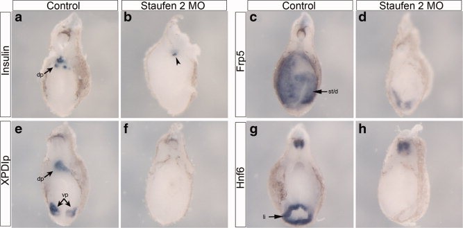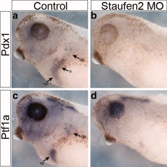 Figure 3. Staufen2 is required for the patterning of the developing anteriorendoderm. a,b:Pdx1 expression by whole mount in situ hybridization in control and Staufen2-MO-injected embryos at NF35, expression of pdx1 is lost in the developing stomach and pancreatic anlagen (83%, n = 12). c,d: NF35 embryo, expression of ptf1a is almost completely lost in the developing dorsal and ventral pancreatic bud (80%, n = 10).