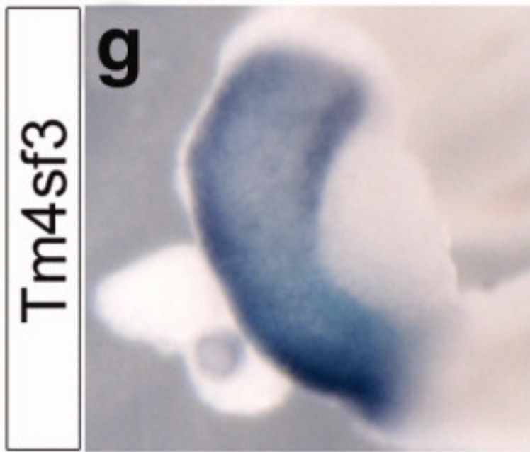 tspan8 (tetraspanin 8) gene expression in an isolated gut tube of Xenopus laevis embryo, NF stage 44, with expression in stomach and bile duct (darker staining, towards bottom)