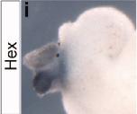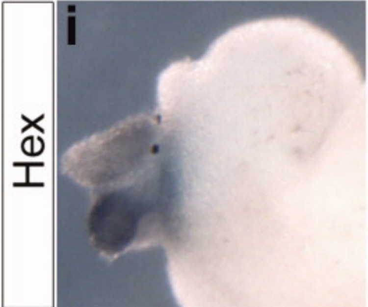 hhex (hematopoietically expressed homeobox) gene expression in an isolated gut tube of Xenopus laevis embryo, NF stage 44, with expression in the liver ( upper out pocketing of foregut) and gall bladder (darker staining, below liver)