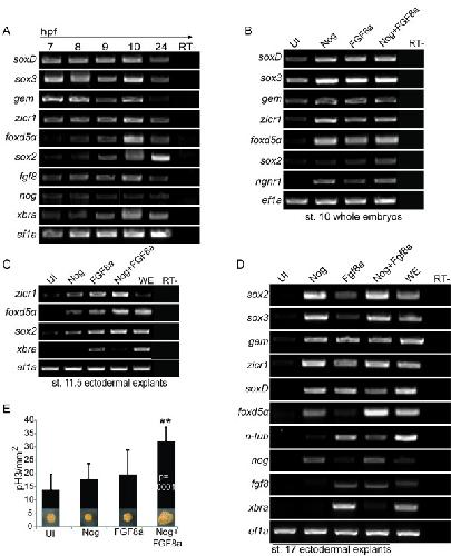 Figure 1. Temporal expression of early neural genes and response to Noggin and FGF8a. Semi-quantitative RT-PCR of early neural genes in embryos over time (A, B) or in ectodermal explants (C, D). Explants are from uninjected (UI) embryos or those injected with mRNA coding for Noggin (Nog), FGF8a, or Nog + FGF8a. Embryos in (A) were collected at the times indicated at top (hours post fertilization = hpf) and explants were collected at stage 11.5 (C) or 17 (D). Ef1a expression is a loading control. Samples without MMLV RTase added were used as RT- controls (far right). (E) Immunohistochemistry for phosphorylated Histone H3 of ectodermal explants dissected from embryos injected with mRNA coding for Nog, FGF8a, or Nog+ FGF8a and cultured to stage 17. Explants injected with Nog+ FGF8a are up to 1.7 fold (cm) bigger than those from uninjected embryos. Graph is showing the number of cells marked with pH3 per mm2 expression in n = 10 explants. Nog+ FGF8a caps have 1.8 fold more pH3 per count area than uninjected explants (p=.0001). UI indicates explants that were dissected from uninjected embryos, WE is whole embryo.
