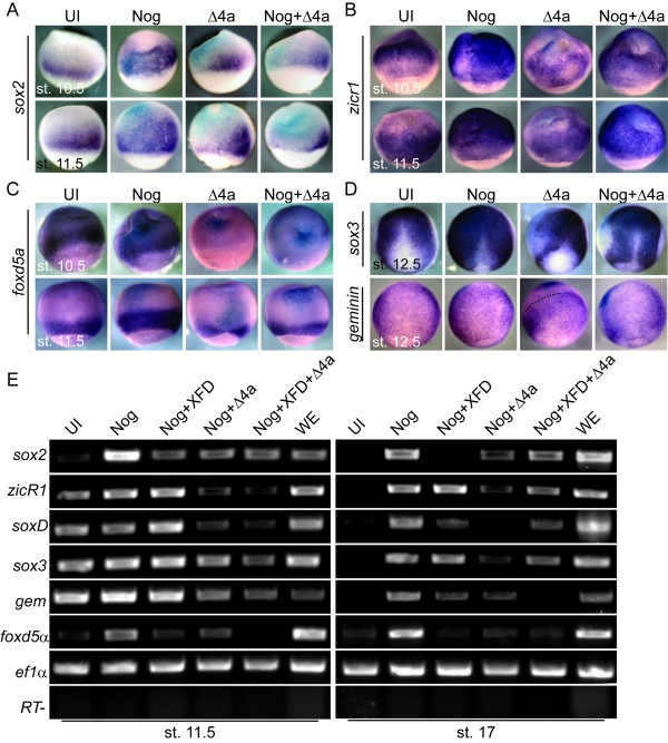 Figure 3. FGF signaling is required for the induction of sox2 and foxd5α expression in the neural plate and the maintenance of other early neural genes. WISH for (A) sox2, (B) zicr1, (C) foxd5α, and (D) sox3 and gem of embryos that were either uninjected (UI) or injected with Noggin (Nog), dominant negative FGFR4a (Δ4a), or Nog + Δ4a and were collected at stages 10.5 and 11.5 (A-C) or 12.5 (D). All embryos are dorsal view with anterior to the top. The dashed line separates the domain of gem expression (right) from that inhibited by Δ4a (top left). (E) RT-PCR of ectodermal explants for genes indicated on the left side of panel. Explants were dissected from embryos that were either uninjected (UI) or injected with mRNA coding for Nog, Nog + dominant negative FGFR1 (XFD), Nog+delta4a, or Nog+XFD+delta4a.