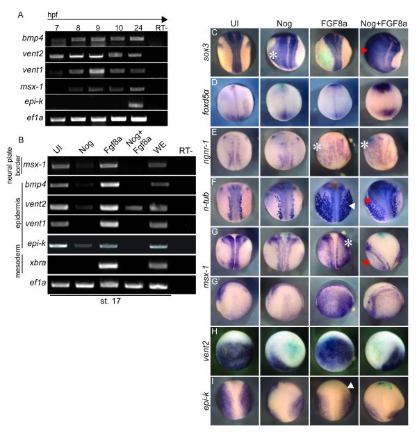 Figure 4. FGF signaling induces neuron formation despite the presence of BMP signaling. (A) RT-PCR of embryos collected at the hpf indicated at the top. Primers are indicated on the left side of the panel. Ef1a was used as a loading control and samples without MMLV RTase added were used as RT- controls (far right). (B) RT-PCR of stage 17 ectodermal explants dissected from uninjected embryos (UI) or embryos injected with mRNA coding for Nog, FGF8a, or Nog+ FGF8a. WE is whole embryo control. Primers for markers of the neural plate border (slug, msx-1), epidermis (bmp4, vent2, vent1, epi-k) and mesoderm (xbra) and are shown on the left side of the panel. (C-I) WISH for (C) sox3, (D) foxd5α, (E) ngnr-1, (F) n-tub, (G, G') msx-1, (H) vent2 and (H) epi-k using embryos that were either uninjected (UI) or injected with either Nog, FGF8a or Nog+ FGF8a and lacZ mRNA. All stage 17 embryos are a dorsal view with anterior to the top (C-G, I) and G' embryos are a lateral view of embryos in G with anterior to the left. Embryos in H are stage 10.5 animal pole view with dorsal to the top. Asterisk indicates expansion in the deep layer of the ectoderm; white arrow indicates expansion in both the deep and superficial ectoderm and red arrow indicates expansion in the superficial layer only.