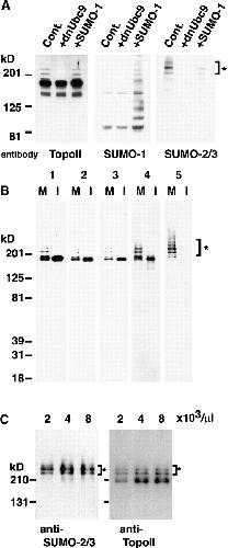 Figure 2. DNA topoisomerase II is modified by SUMO-2/3 in M-phase extracts. (A) CSF extracts containing 10,000 sperm nuclei/μl were incubated at 23°C for 60 min with or without exogenous 30 ng/μl His-SUMO-1 or 150 ng/μl dnUbc9. Aliquots were analyzed by immunoblotting with anti–Xenopus topoisomerase II, anti-SUMO-1, and anti-SUMO-2/3 antibodies. (B) CSF extract containing 10,000 sperm nuclei/μl was incubated 60 min at 23°C. The reaction was split, and half was driven into interphase though the addition of 0.6 mM CaCl2. Each reaction was incubated at 23°C for an additional 30 min. Chromatin was isolated from both mitotic and interphase extracts, as described in Materials and methods. The chromatin was subjected to Western blotting with the following antibodies: (1) monoclonal anti–human topoisomerase IIα/β (DNATop2AB); (2) monoclonal anti–human topoisomerase IIα; (3) polyclonal anti– human topoisomerase IIα; (4) anti–Xenopus topoisomerase II; and (5) anti-SUMO-2/3, respectively. Note that topoisomerase IIα is essentially the sole form of topoisomerase II in egg extracts. (C) CSF extracts containing the indicated number of sperm nuclei/μl were incubated at 23°C for 60 min. Equal amounts of isolated chromatin were subjected to SDS-PAGE and analyzed by Western blotting using anti-SUMO-2/3 and anti-topoisomerase II antibodies. Asterisks indicate SUMO-conjugated forms of topoisomerase II in all panels.