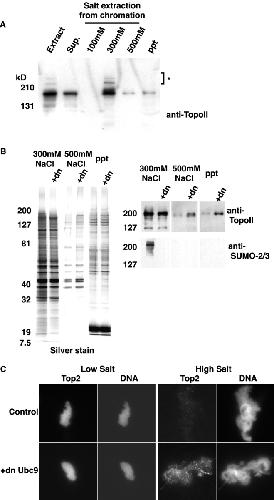 Figure 5. SUMO-2/3–modified DNA topo-isomerase II is associated with chromatin. (A) CSF extracts containing 10,000 sperm nuclei/μl were incubated at 23°C for 60 min, and chromatin was isolated from each reaction as described in Materials and methods. Chromatin was extracted with XB buffer supplemented with 5 mM β-glycerol phosphate plus 100, 300, or 500 mM NaCl sequentially. Equal amounts of all fractions were subjected to SDS-PAGE and Western blotting with anti-topoisomerase II antibody, as indicated. (B) CSF extracts containing 10,000 sperm nuclei/μl were incubated at 23°C for 60 min, in the absence or presence of dnUbc9 (+dn; 150 ng/μl). Chromatin was isolated from each reaction as described in Materials and methods. Chromatin was extracted as above and equal concentrations of the supernatants from the 300-mM NaCl extraction (left two lanes in each panel), 500-mM NaCl extraction (middle two lanes in each panel), and final pellet (right two lanes in each panel) were subjected to SDS-PAGE and either silver staining (left) or Western blotting (right) with anti-topoisomerase II and anti-SUMO-2/3 antibodies. (C) Mitotic chromosomes were assembled in CSF extracts at 23°C for 60 min in the presence or absence of dnUbc9. The chromosomes were low salt (CSF-XB) or high salt (CSF-XB + 200 mM NaCl) buffers and stained with monoclonal anti–human topoisomerase IIα/β antibodies, as described in Materials and methods. DNA was visualized with Hoechst 33342. All topoisomerase II immunofluorescence images were taken using the identical exposure time.