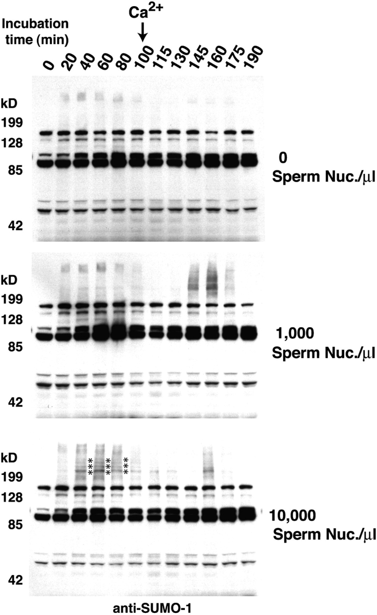Figure 1. Chromatin-dependent SUMO conjugation of mitotic substrates. CSF extracts were supplemented with histidine-tagged SUMO-1 (final concentration 30 ng/μl) and with the indicated number of sperm nuclei. After formation of condensed metaphase chromosomes (90 min after the start of the reaction), CSF arrest was released into interphase by addition of 0.6 mM CaCl2. The SUMO-1–conjugated protein profile throughout the reaction was analyzed by Western blotting with affinity-purified anti-SUMO-1 antibodies. There were a series of strong M-phase–specific SUMO-1 conjugates observed in the reaction containing 10,000 sperm nuclei/μl (bottom, indicated by an asterisk). These bands could also be weakly observed in the reaction containing 1,000 sperm nuclei/μl, but were absent in the reaction without nuclei. These bands were lost after the extracts entered interphase. These characteristics indicated that the bands resulted from modification of mitotic substrates in a chromatin-dependent manner.
